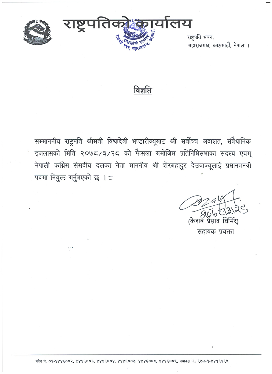 राष्ट्रपति भण्डारीले मंगलबार देउवालाई प्रधानमन्त्री नियुक्त गर्दा संविधानको धारा उल्लेख नगरी सर्वोच्च अदालतको फैसला बमोजिम प्रधानमन्त्री नियुक्त गरेको उल्लेख गरेकी छिन् । तर देउवाले भने आफूले धारा ७६ (५) अनुसार प्रधानमन्त्रीमा दावी पेश गरेको र सर्वोच्च अदालतले त्यसै धारा अनुसार प्रधानमन्त्री नियुक्तिका लागि परमादेश दिएको भन्दै राष्ट्रपतिलाई नियुक्ति सच्याउन आग्रह गरेका हुन् ।