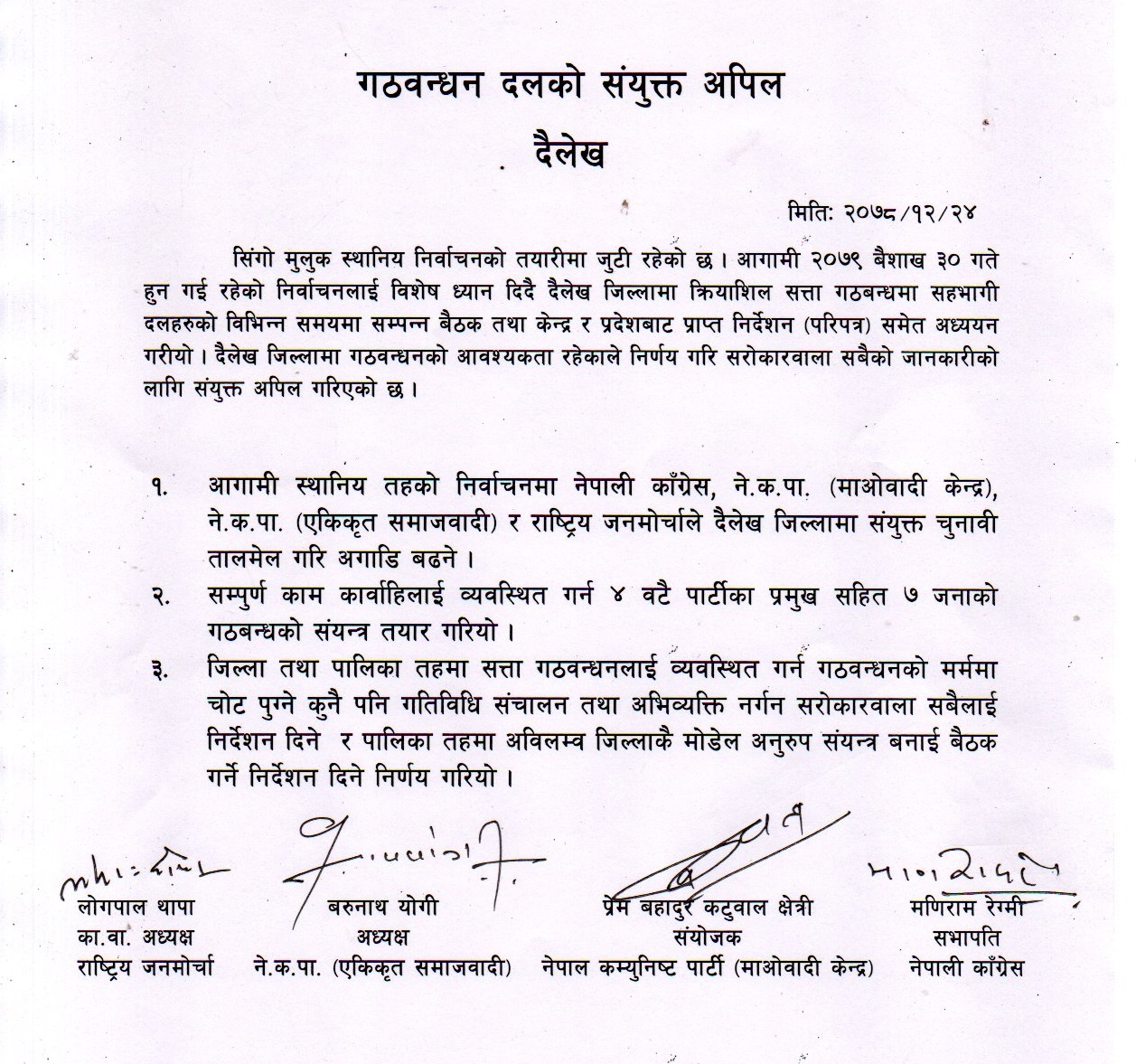 आज (बिहीबार) बसेको सत्ता गठबन्धन दलको बैठकले आगामी निर्वाचनमा नेपाली काँग्रेसका नेकपा (माओवादी केन्द्र) नेकपा (एकीकृत समाजवादी) राष्ट्रिय जनमोर्चाका प्रमुख पदाधिकारीको संयुक्त अपिल जारी गर्दै जिल्लाका ११ वटै स्थानीय तहका सबै ९० वटै वडामा गठबन्धन गर्ने निर्णय गरेको छ।