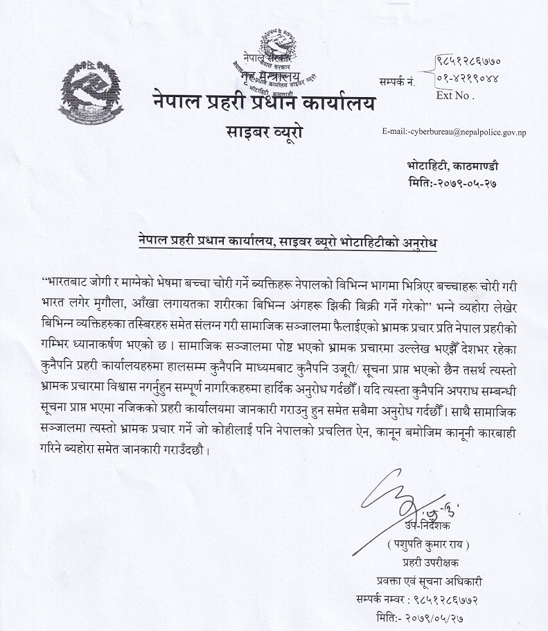 केही दिन अगाडी देखि सामाजिक सञ्जाल फेसबुक तथा टिकटकमा बच्चा चोरी गर्ने गिरोह सक्रिय रहेको चर्चा चलेपछि प्रहरीको साइबर ब्युरोले सूचना निकालेर अफवाह नफैलाउन आग्रह गरेको छ ।