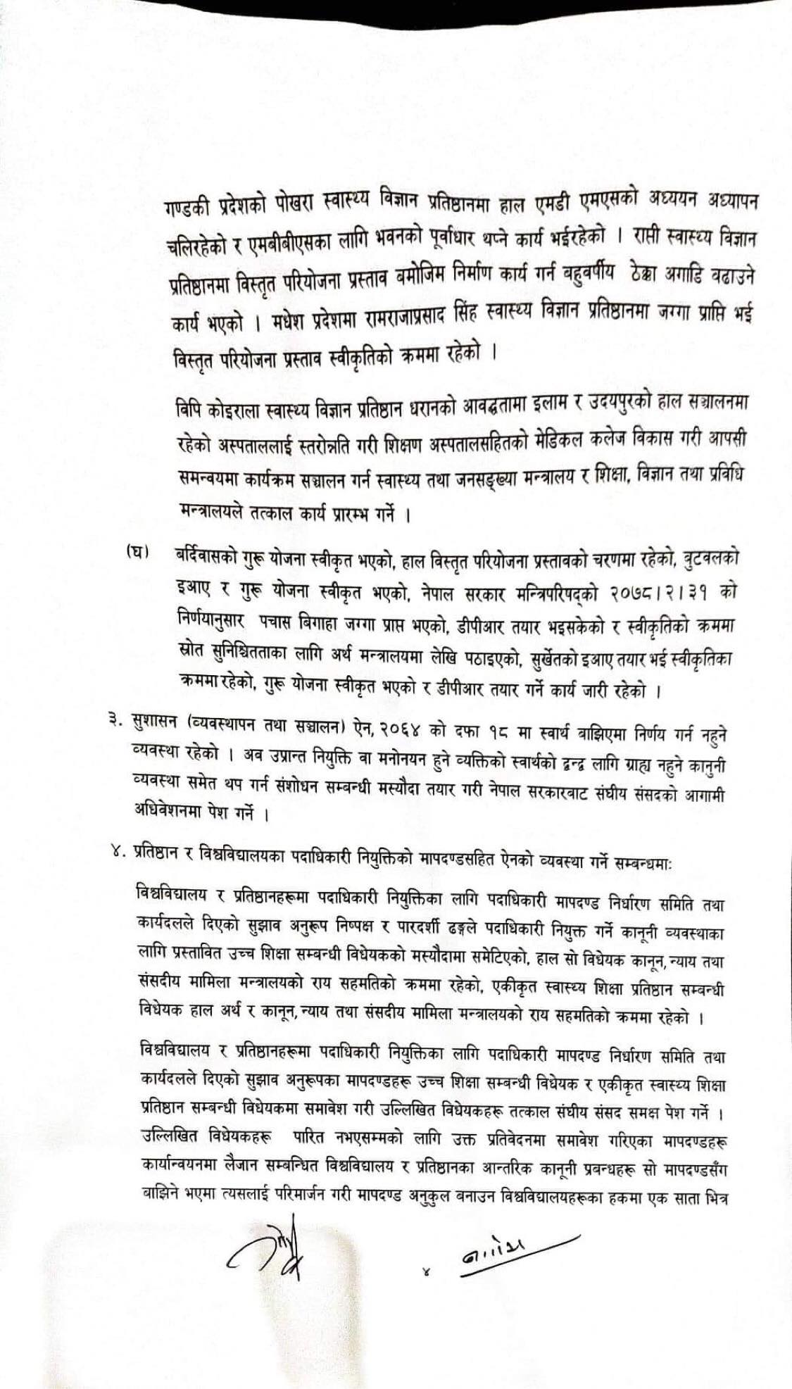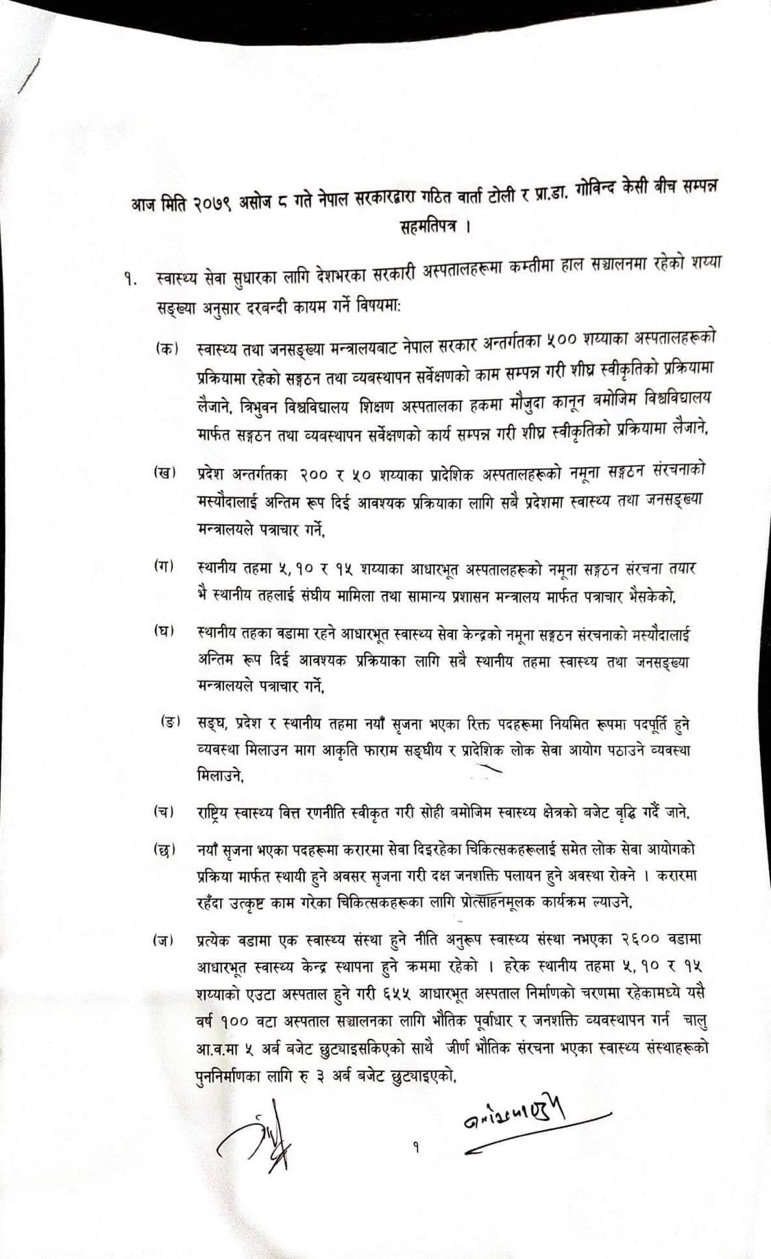 केसीका मागमध्ये धरानस्थित बीपी कोइराला स्वास्थ्य विज्ञान प्रतिष्ठानका पदाधिकारीलाई बर्खास्त गर्ने मागका विषयमा भने कुनै सहमति हुन सकेको छैन । पत्रकार सम्मेलनमा डा. केसीले समयसीमाभित्र माग सम्झौता कार्यान्वयन नभए फेरि अनशन बस्ने चेतावनी दिएका छन्।