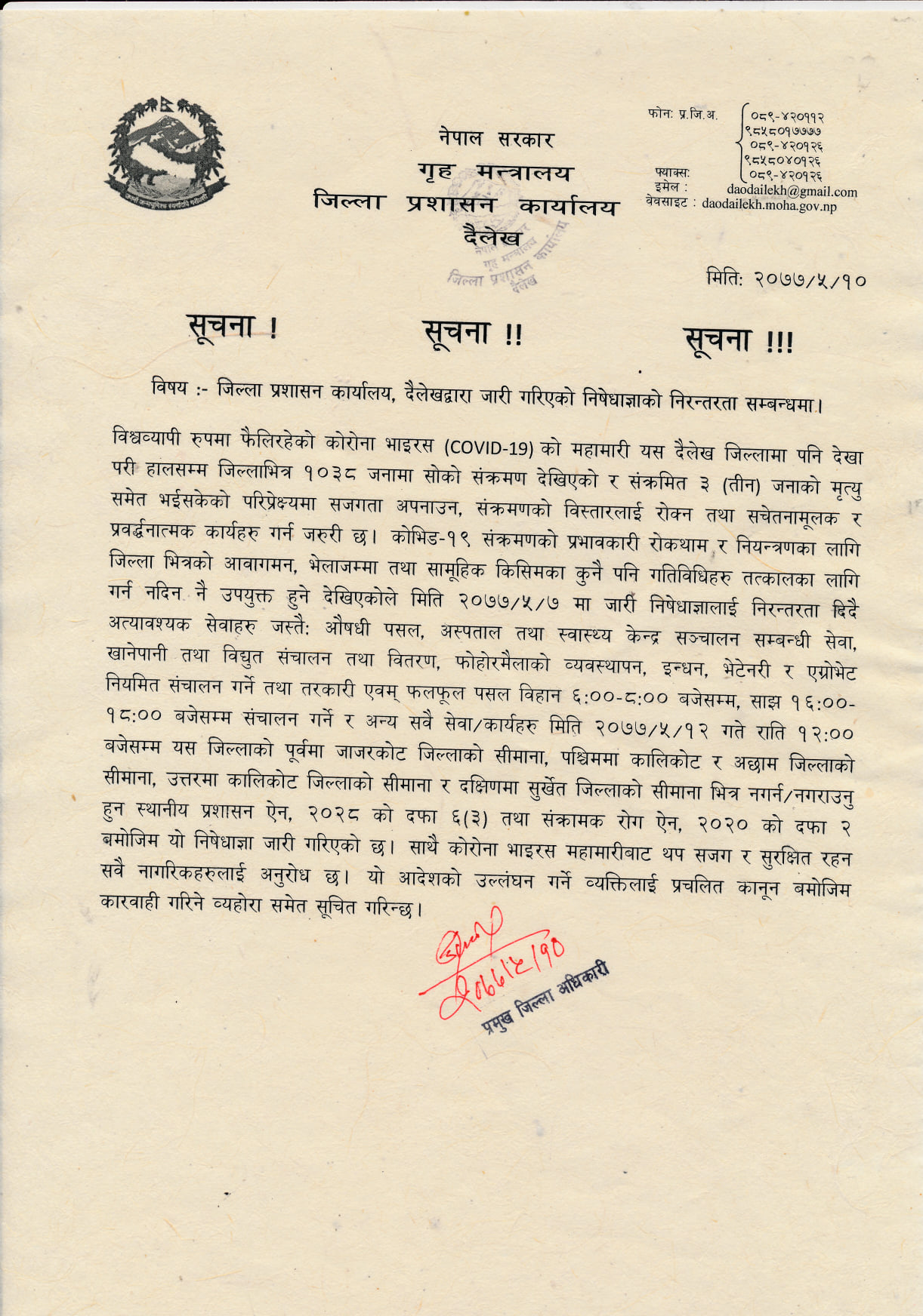 स्थानिय प्रशाशन ऐन २०२० को दफा ६ (३) तथा सक्रामक रोग एन २०२० को दफा २ बमोजिम जिल्लाको पुर्वमा जाजरकोट जिल्लाको सिमाना, पश्चिममा कालिकोट र अछाम जिल्लाको सिमाना उत्तरमा कालिकोट जिल्लाको सिमाना र दक्षिणमा सुर्खेत जिल्लाको सिमाना भित्र कुनै पनि गतिबिधि नगर्न नगराउन आदेश जारी गरेको छ ।