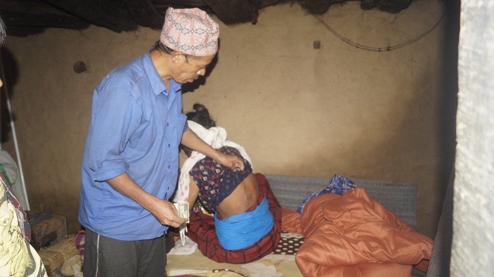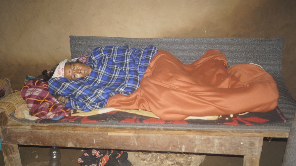 क्याप्सन ः आर्थिक अभावले औषधी किन्ने पैसा नपाएर ओछ्यानमा थलिएकी ठाटीकाँध गाउँपालिका ३ की चन्द्रादेवी आले । साउन १ पहिरोमा परि आलेको मेरुदण्ड र हात भाँचिएको छ ।